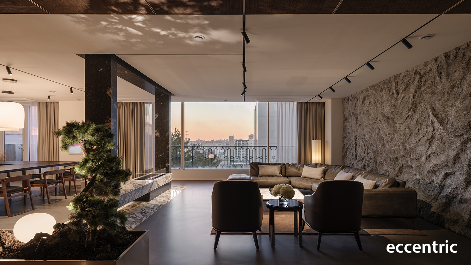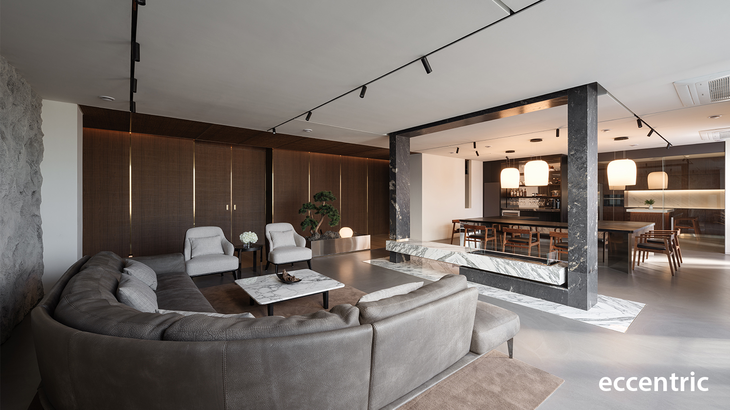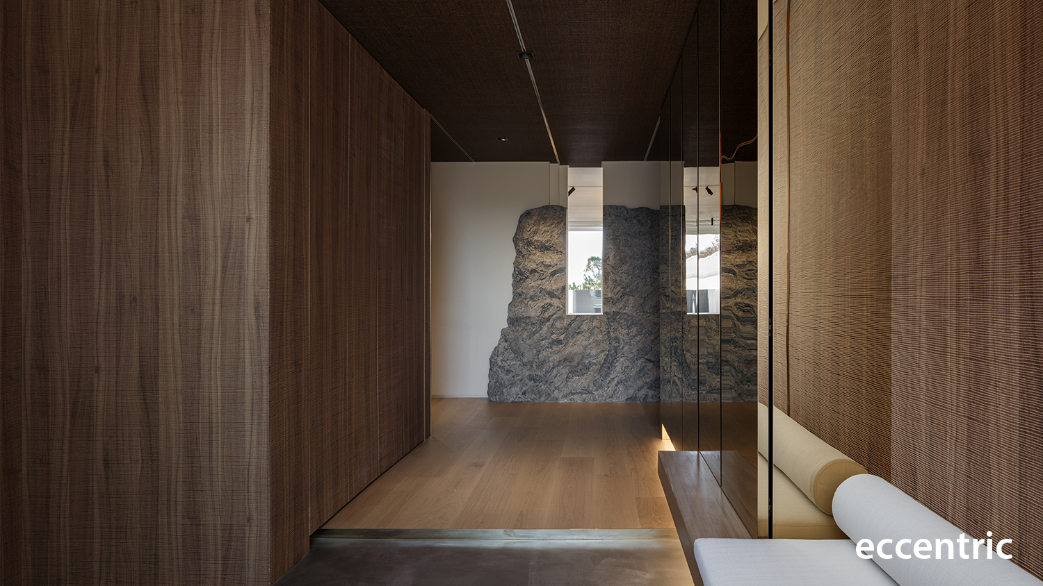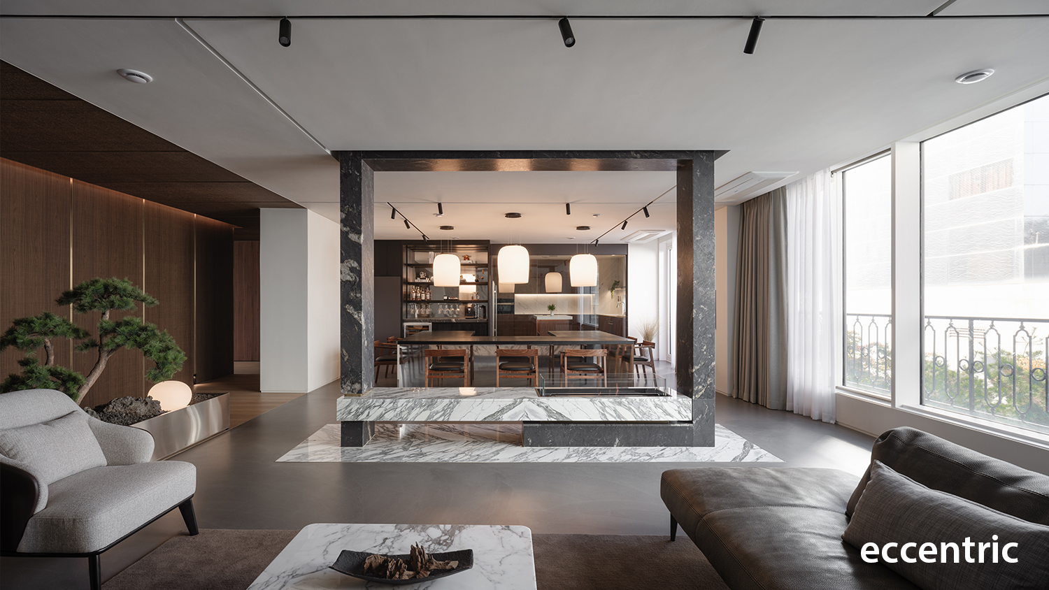 Led by Eccentric Design Lab of Hanyang University and the team of Studio Eccentric, the main approach for the full renovation of 240 square-meter residential project was to create an atmosphere in well balancing the distinct elements of function, experience, colors, and materials. The initial step was to redefine the boundaries of each program and rearrange them accordingly to match the planned out experience; especially in the living zone and the dining zone to allow constant communication and interaction with other family members and friends. Then the barrier wall in the existing condition between the two areas was demolished and instead installed a rectangle-shaped articulated marble gate. Not only this would work as the main function of a fireplace along with a bench, but also as a portal allowing people to engage one another while enjoy food in the dining zone and resting at the living zone.