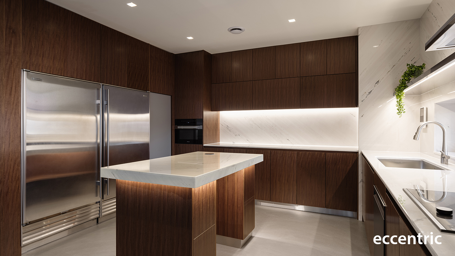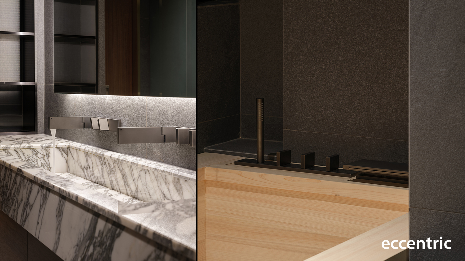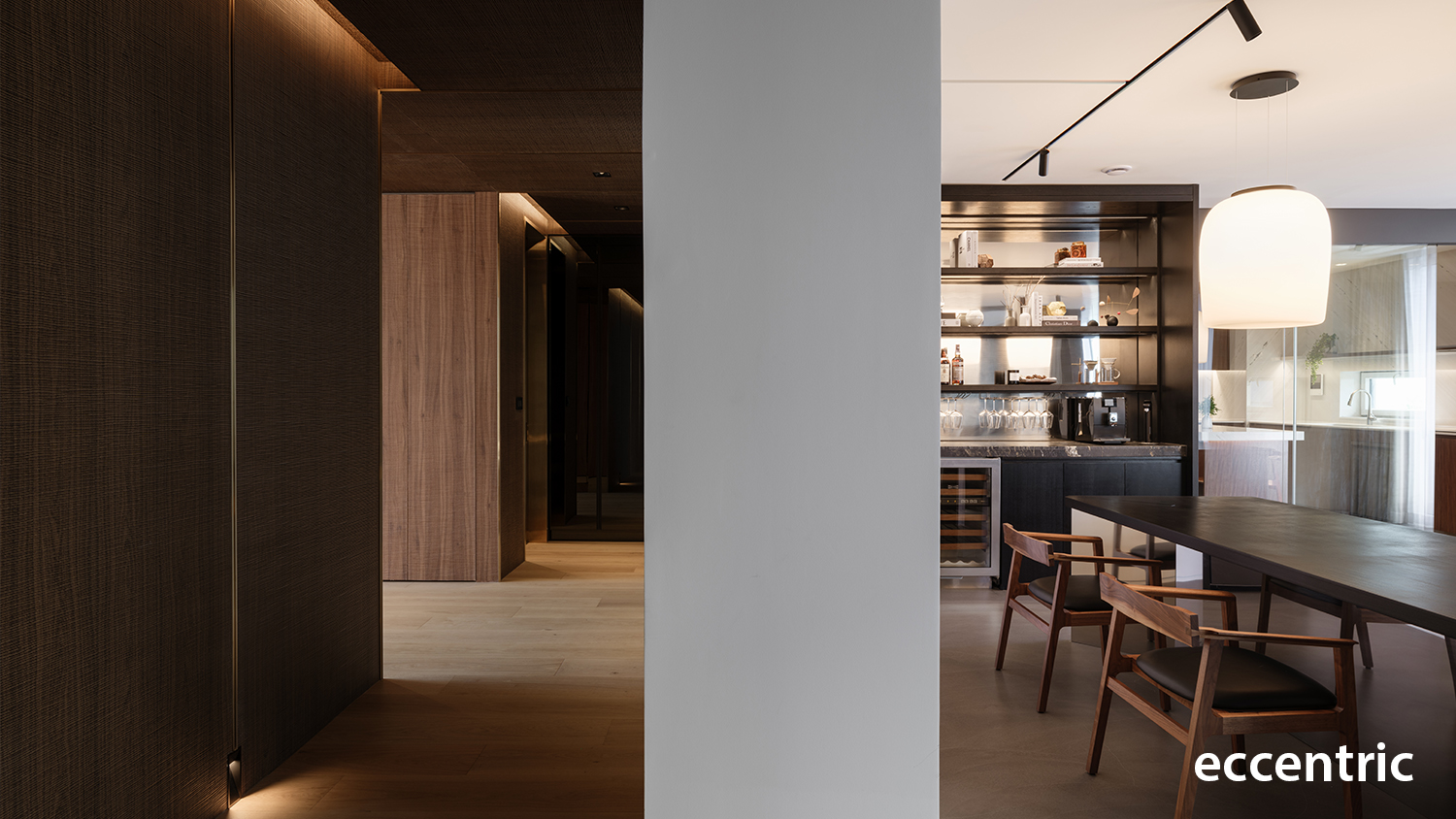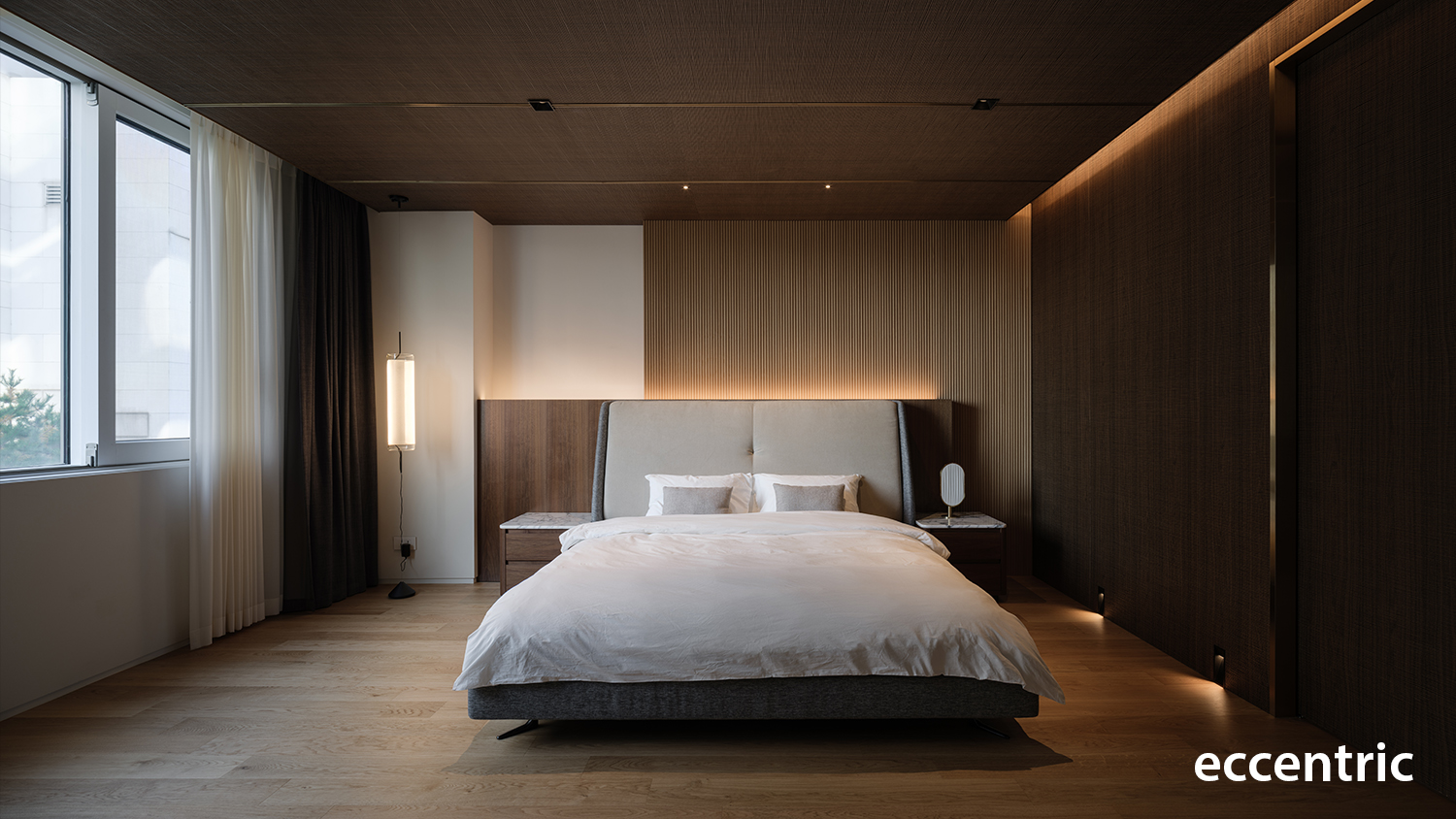 Led by Eccentric Design Lab of Hanyang University and the team of Studio Eccentric, the main approach for the full renovation of 240 square-meter residential project was to create an atmosphere in well balancing the distinct elements of function, experience, colors, and materials. The initial step was to redefine the boundaries of each program and rearrange them accordingly to match the planned out experience; especially in the living zone and the dining zone to allow constant communication and interaction with other family members and friends. Then the barrier wall in the existing condition between the two areas was demolished and instead installed a rectangle-shaped articulated marble gate. Not only this would work as the main function of a fireplace along with a bench, but also as a portal allowing people to engage one another while enjoy food in the dining zone and resting at the living zone.