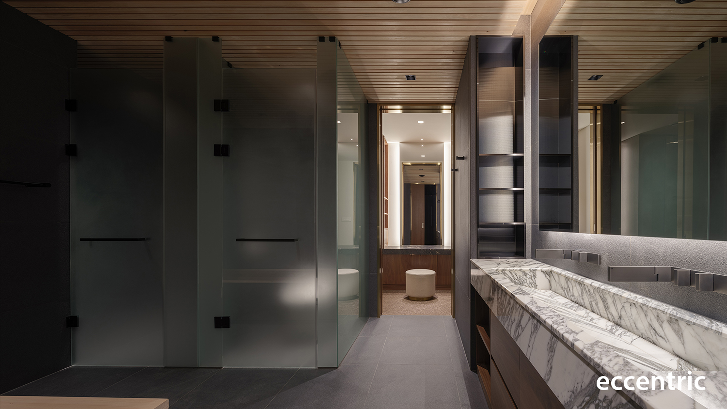 This spatial language has been extended to the bedrooms where again different materials and elements have been layered on the walls along with the ceiling to create spatial depth. In using the same materials and the color palette from the living and dining zone but in a more settled mood, these have given a calm and serene atmosphere allowing the users to only focus on themselves and their ultimate relaxation. Along with the overall design aspects, functional points have been carefully considered as well reflecting the lifestyle of the client and his family.